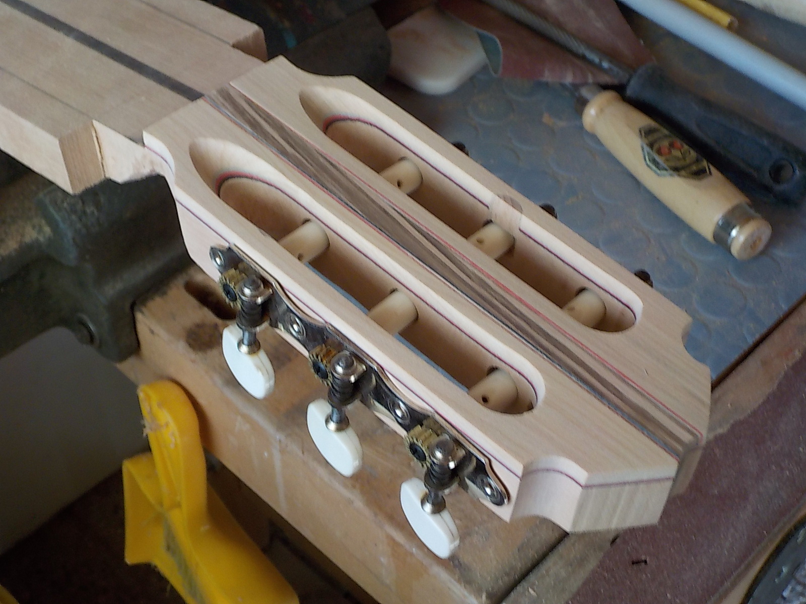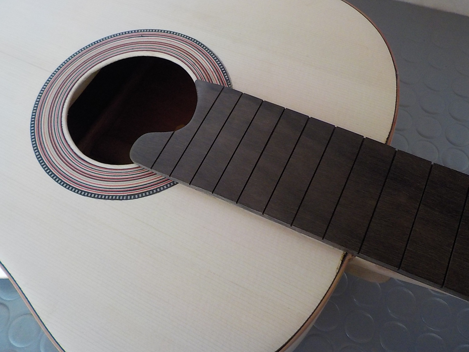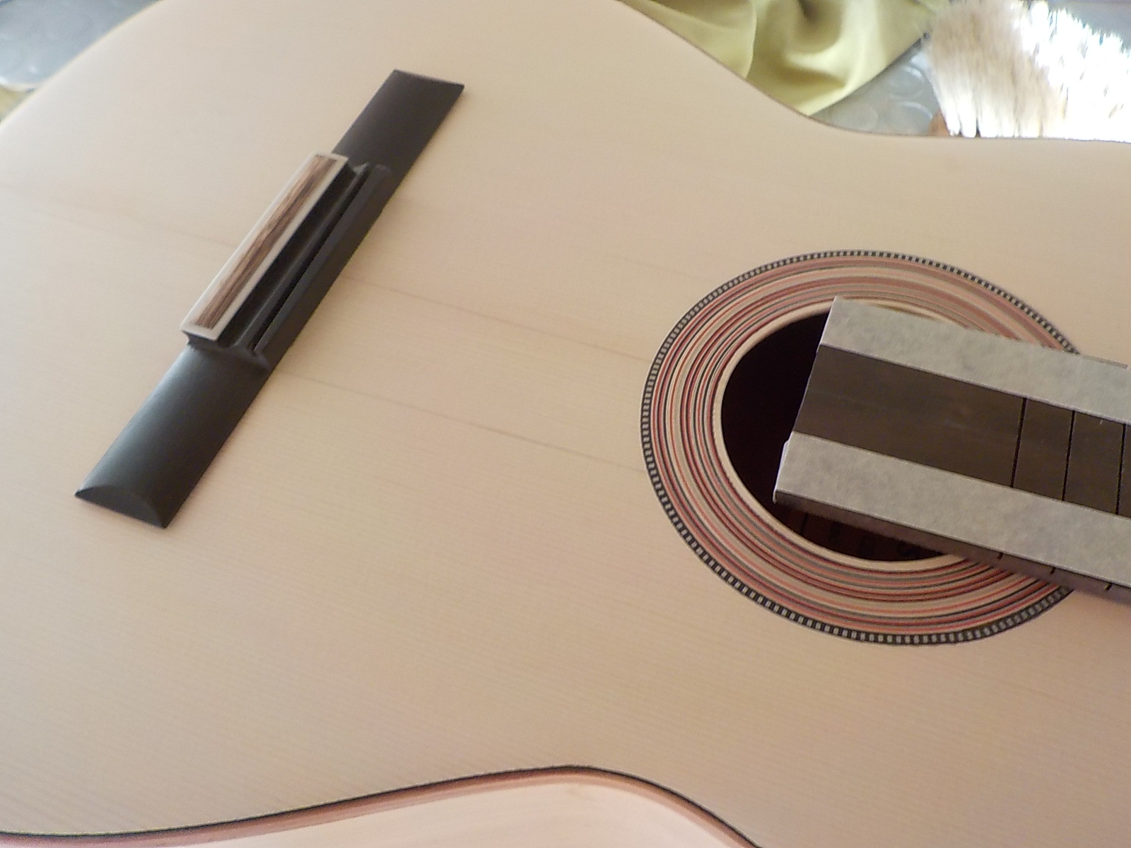 Mario mi ha comunque fornito il resto dei legni necessari: un piano armonico del 2008, un manico in cedrella con relativo tallone e una tastiera in ebano; controfasce, peones, filetti, zocchetto, catene e raggiere provengono dalle mie scorte di laboratorio; il ponticello è un ulteriore ricordo dell’amico Federico Cavagna e la rosetta è di mia produzione.