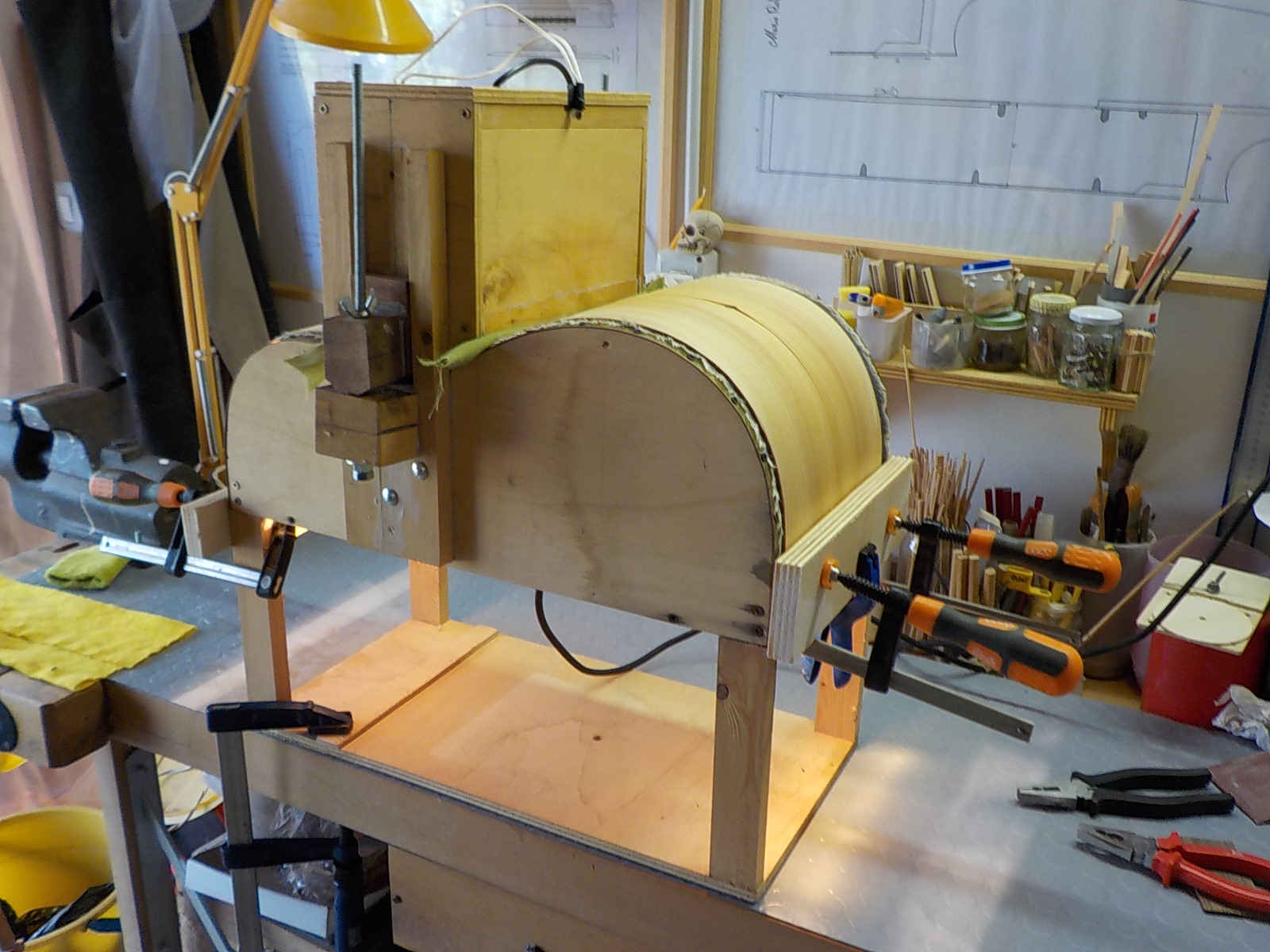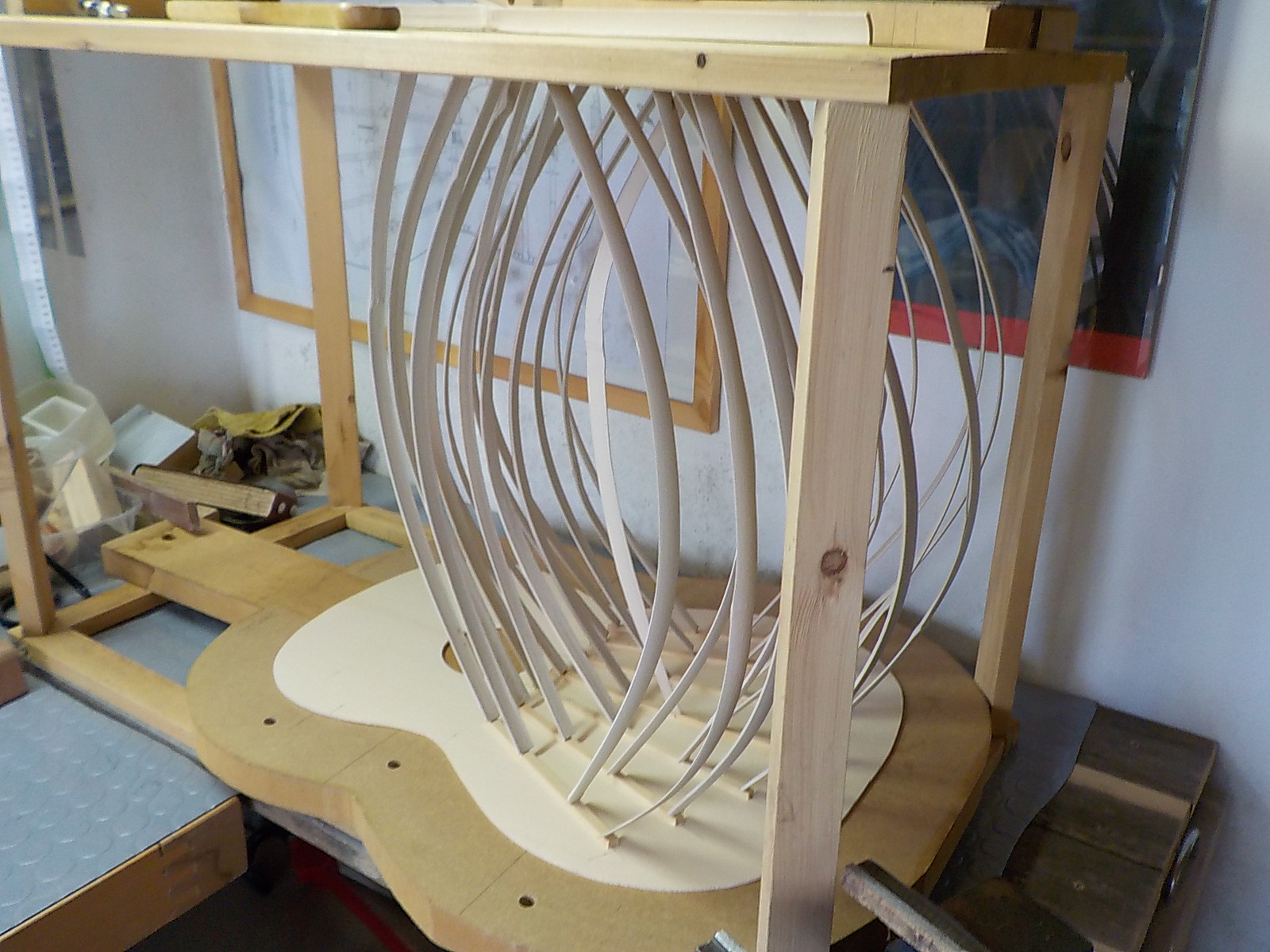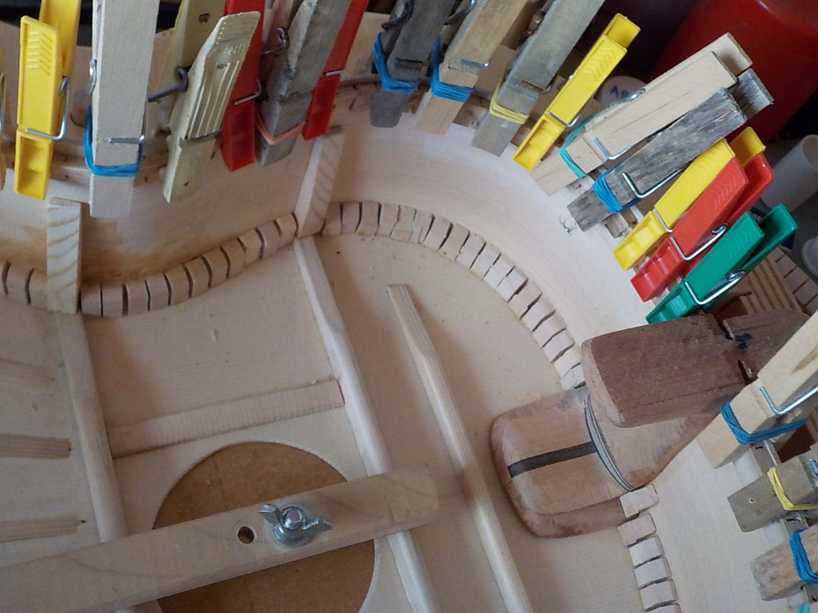 Con il mese di ottobre sono ritornato a frequentare settimanalmente il laboratorio di Mario al quale ho portato il nuovo lavoro da vedere; stante il fatto che si tratta di uno strumento interamente costruito nel mio piccolo laboratorio di campagna (l’unico – ancorchè importantissimo – apporto del macchinario di precisione di Mario è stata infatti la calibratura di delle fasce, del fondo e del piano armonico) le critiche non sono mancate, ma si è trattato unicamente di dettagli estetici; l’importante è che la costruzione, le misure, gli spessori e le procedure siano stati rispettati.