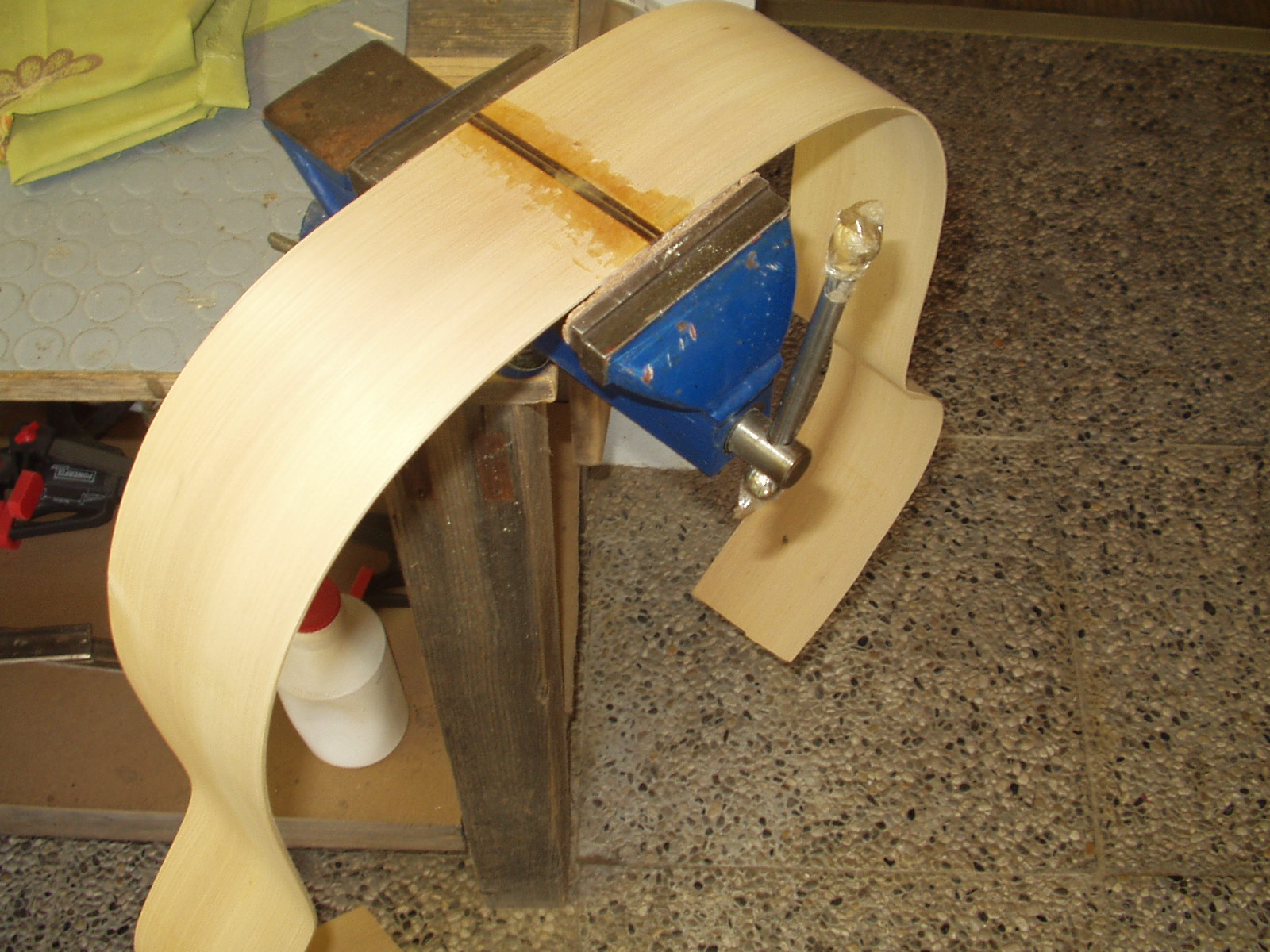 Per le fasce e il fondo ho utilizzato ancora il cipresso dell’amica Maria, attingendo alla scorta realizzata nel laboratorio del maestro Rubio; ho piegato due fasce che ho lasciato inserite nella forma e ho realizzato il fondo con un sottile inserto di palissandro indiano fra le due tavole.
