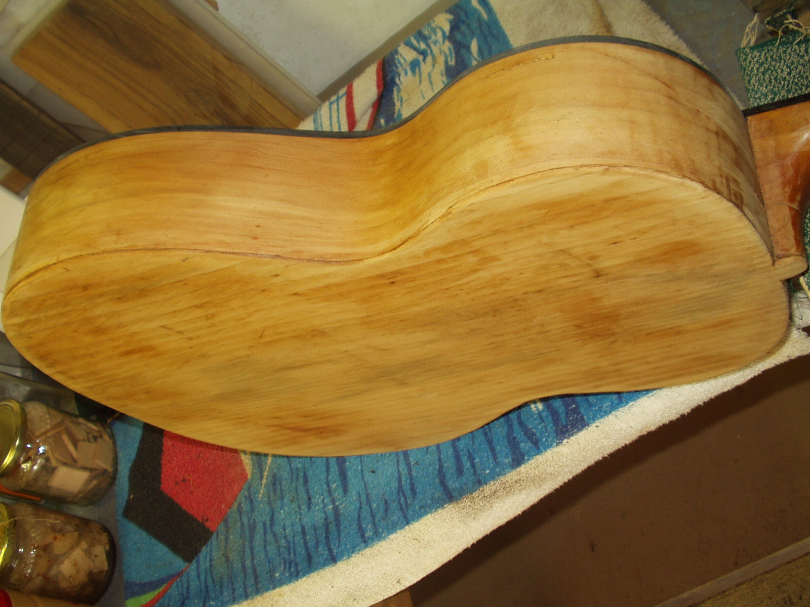 Una volta smontate le corde e le meccaniche, ho scollato il fondo, con relativa facilità; la colla a suo tempo utilizzata era infatti di tipo animale applicata a caldo quindi, con una spatola sottilissima, piccoli spruzzi d’acqua indirizzati nell’apertura praticata e un soffio continuo di aria calda mirato a sciogliere la colla, nel giro di circa tre ore ho aperto lo strumento.