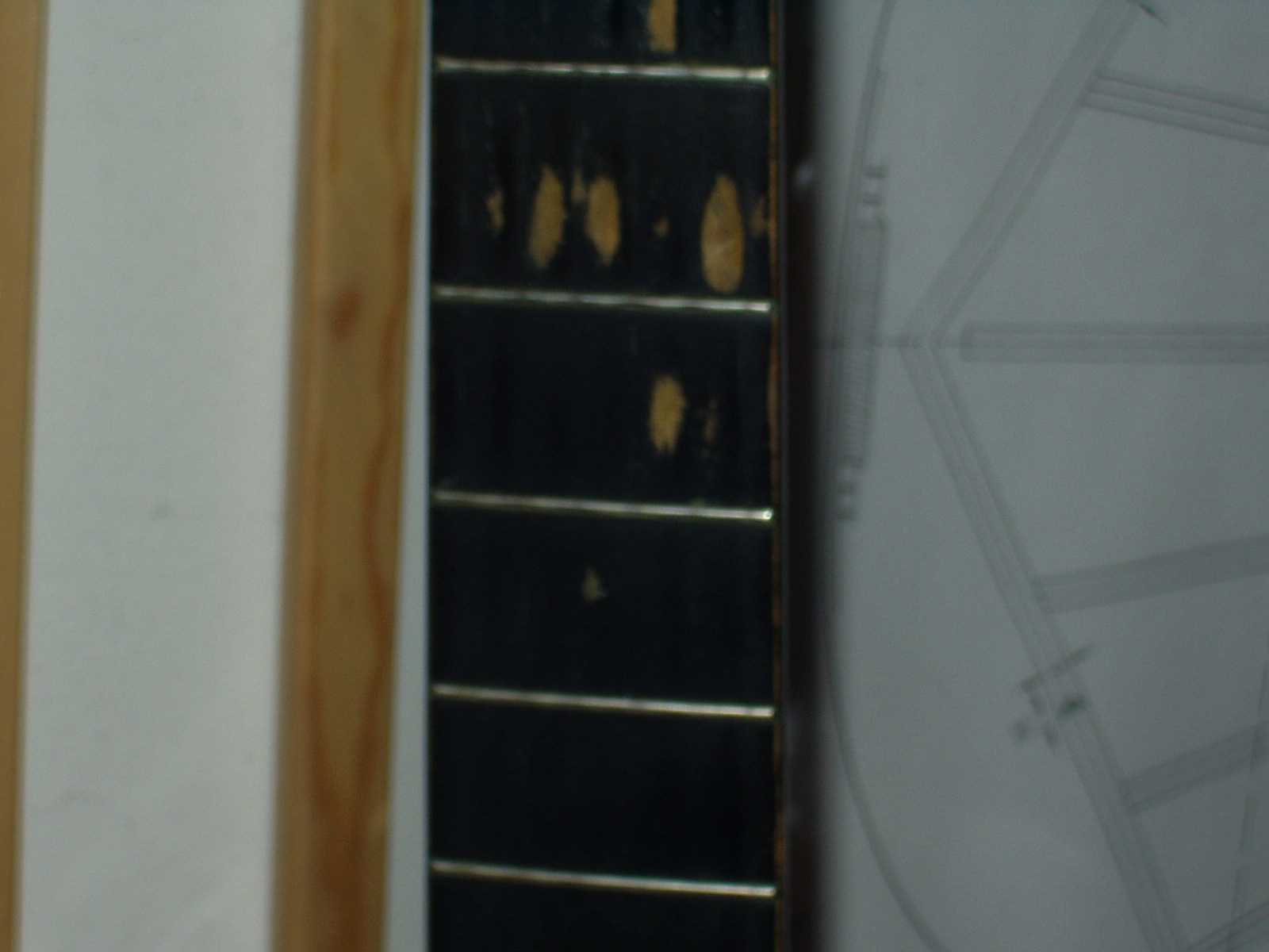 Eliminato il truciolare, ho levigato il multistrato e ho applicato una lastrina di ebano da 4 mm sulla quale avevo preventivamente praticato i tagli per l’applicazione dei tasti. Il risultato pratico è stato apprezzabile in quanto la chitarra ha ora una tastiera in ebano, ancorchè sottile, molto scorrevole e facile; sotto il profilo estetico non è il massimo dato che a ben guardare il manico di profilo si notano i diversi strati applicati l’uno sull’altro e l’operazione di “maquillage” per uniformare la pesante vernice originale del manico con il velo di gommalacca da me in seguito applicato poteva riuscire meglio; comunque l’amico Vincenzo è soddisfatto di avere una chitarra con la quale si ritrova a suonare facilmente e volentieri.
