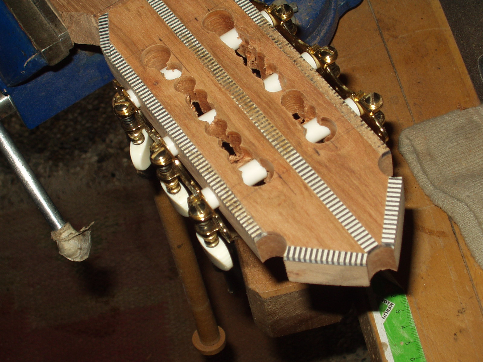 Ho iniziato unendo due assicelle di abete che avevo in casa da tempo (tagliato nel 2003) per realizzare il piano armonico, sul quale ho inserito una rosetta dal disegno classico e poco appariscente; ho poi unito le due parti del fondo con un inserto sottile sei millimetri composto di piallacci da 0,6 bianchi e neri in orizzontale.