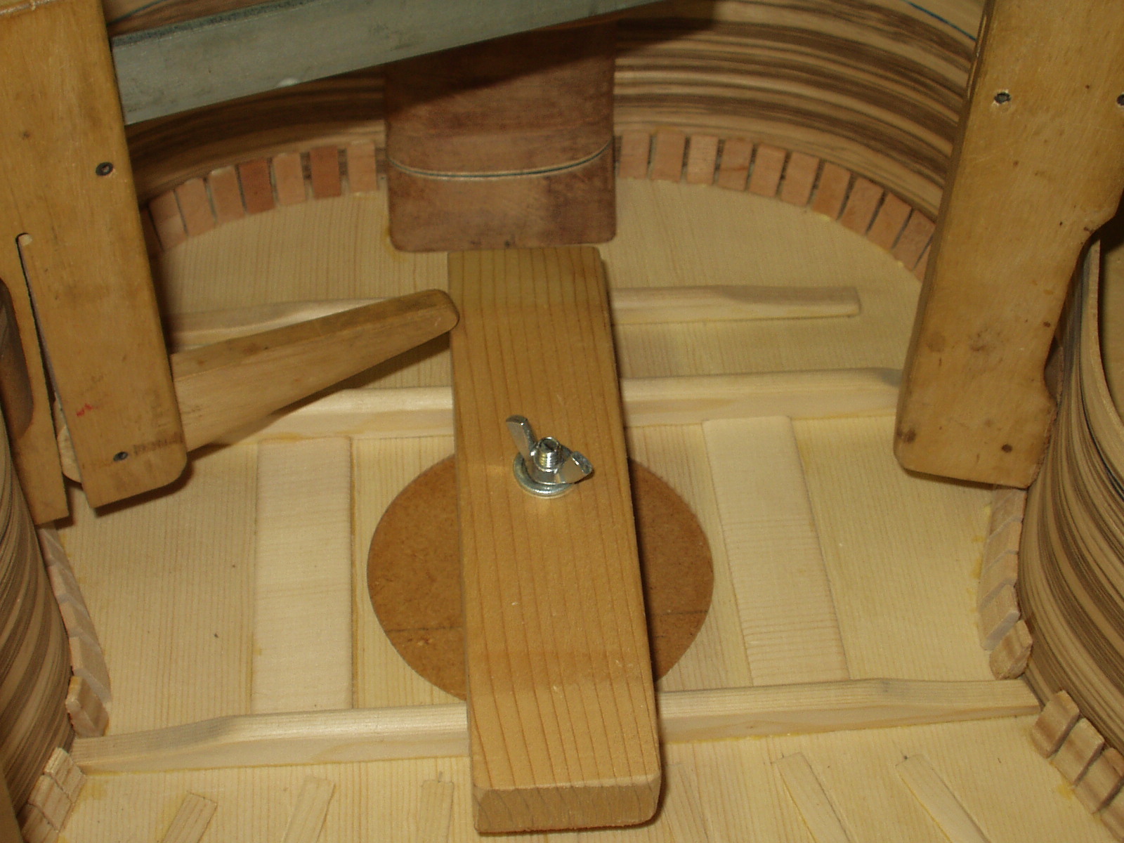 Ho anche predisposto catene, controfasce e peones; per questi elementi ho utilizzato legni provenienti dagli alberi del mio giardino di Mornico, tiglio e nocciolo; da un vecchio ciliegio ho tagliato un grosso ramo morto dal quale ho ricavato il copripaletta e il ponticello; entrambi sono stati decorati con gli stessi inserti bianconeri utilizzati per il fondo.